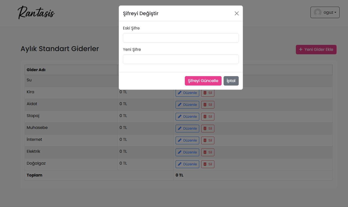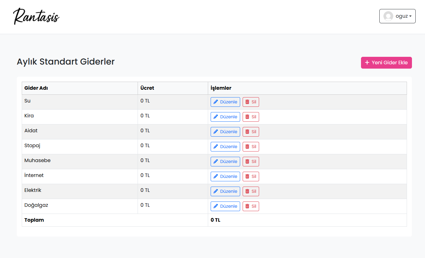 i. Sayfanın sağ üst tarafında bulunan “İsminizin yazdığı” butonuna tekrar tıklayarak “AYLIK STANDART GİDERLER” sekmesini tıklayınız ve aşağıdaki şekilde açılan sayfada, aylık sabit giderlerinizle ilgili bilgileri giriniz;